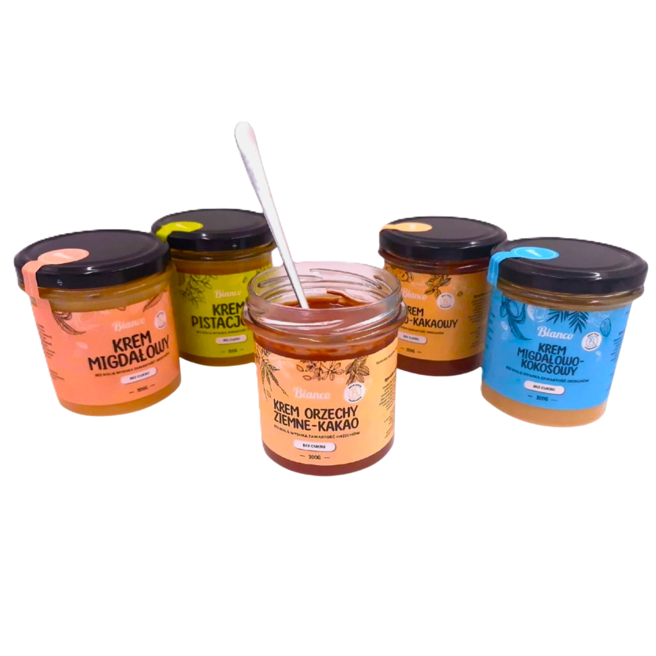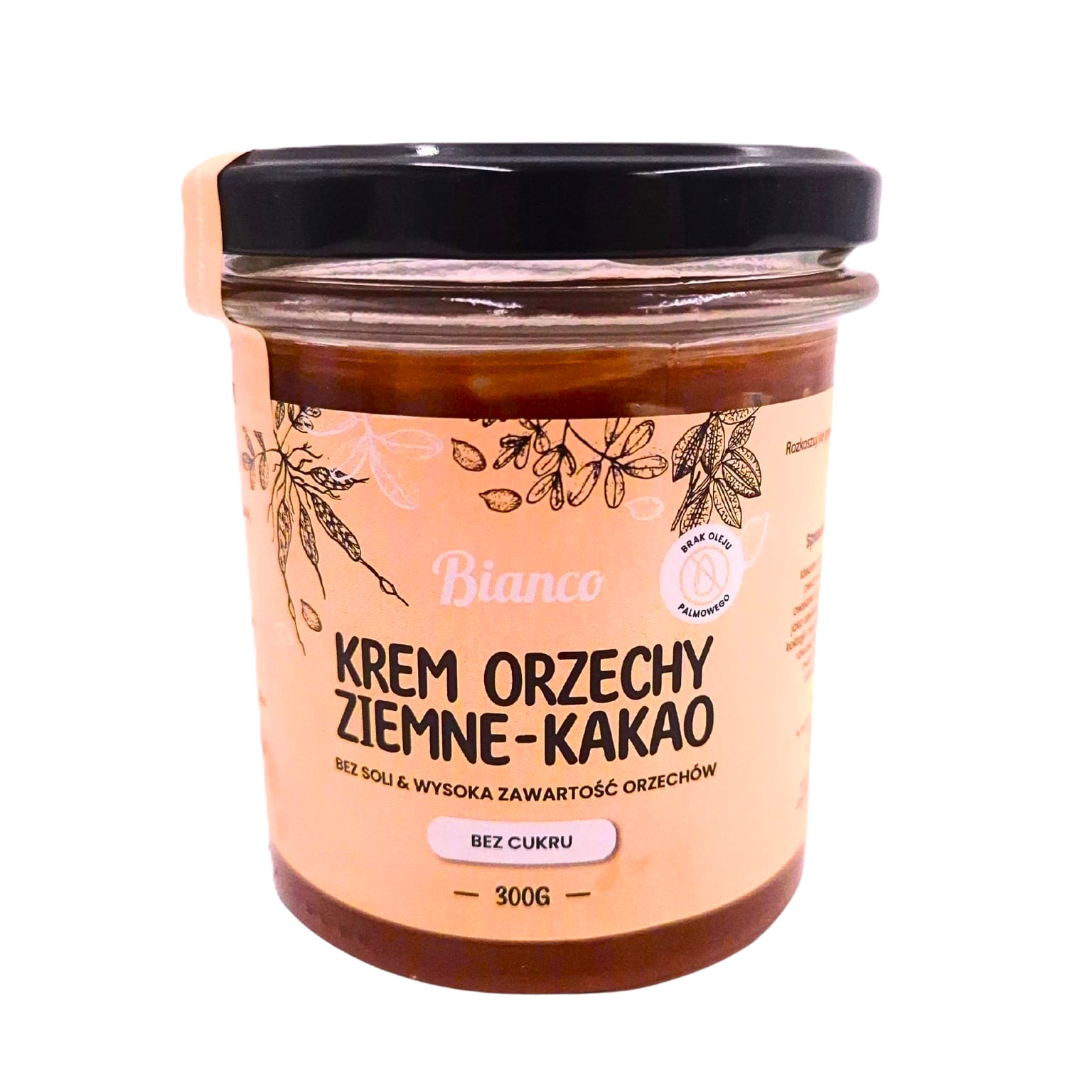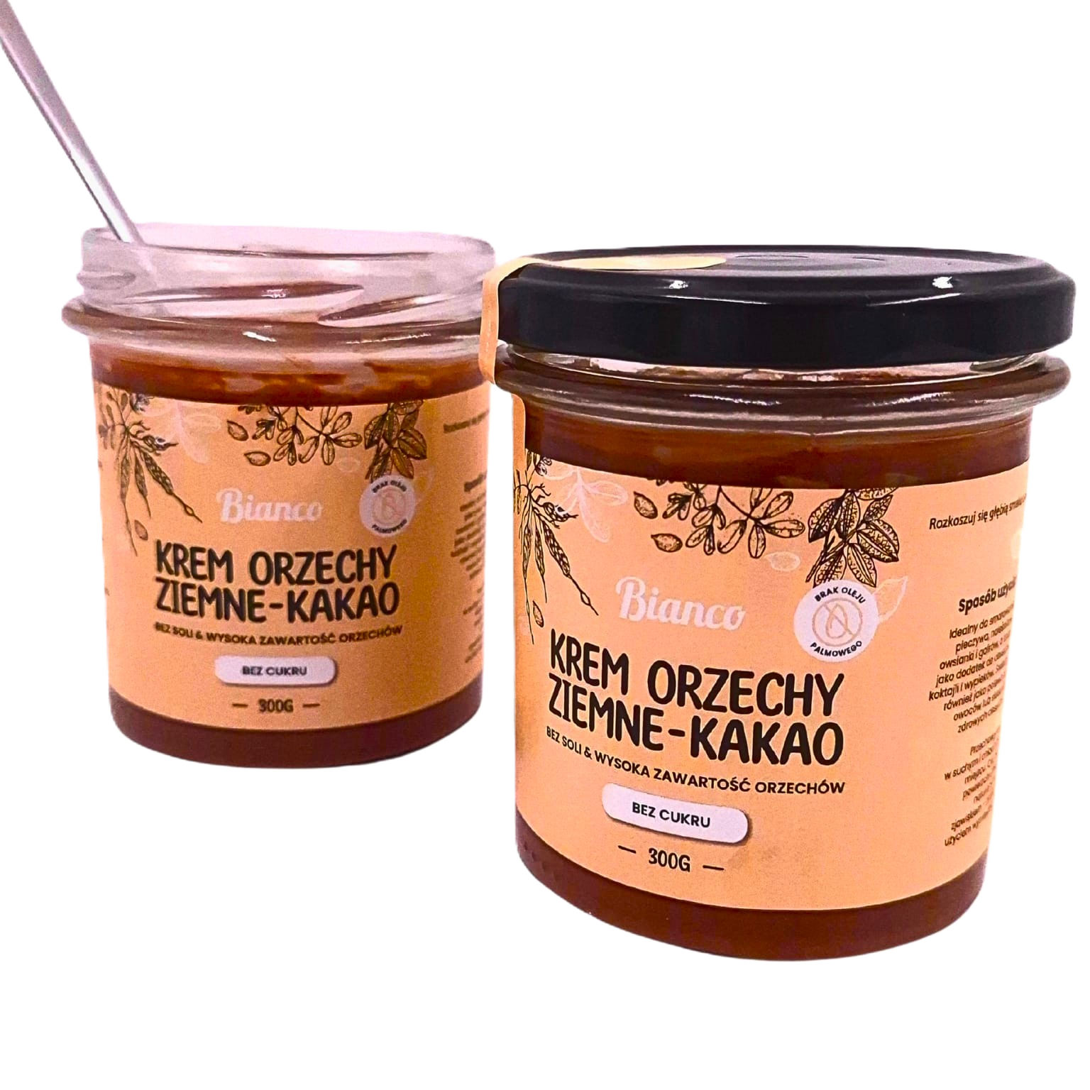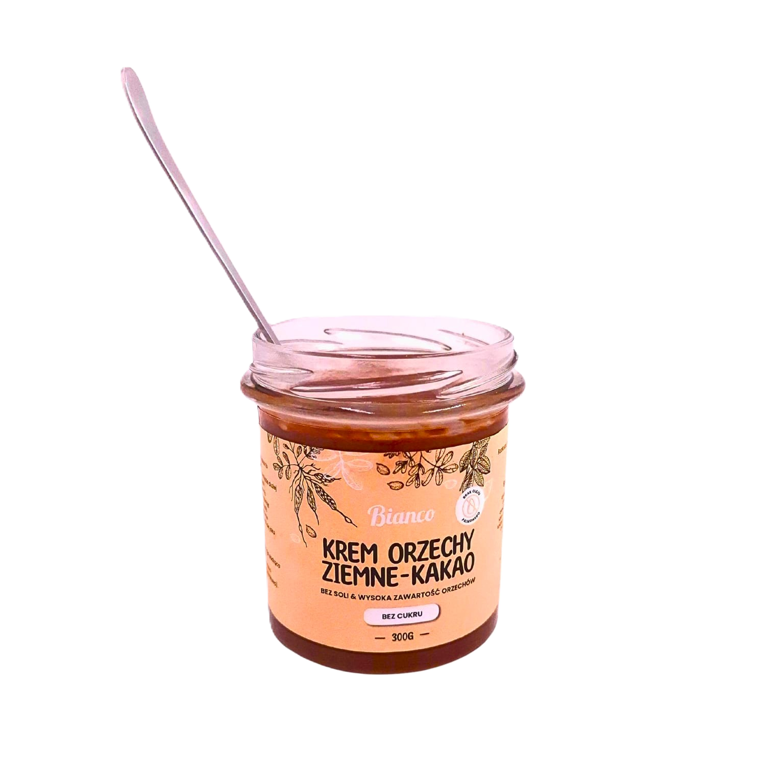 Rzemieślniczy krem z orzechów ziemnych i kakao bez cukru, tworzony w małych partiach. Intensywny smak prażonych orzeszków, aksamitne kakao i delikatna słodycz z maltitolu. Idealny do smarowania, deserów i zdrowych przekąsek — naturalny, kremowy i bez zbędnych dodatków.