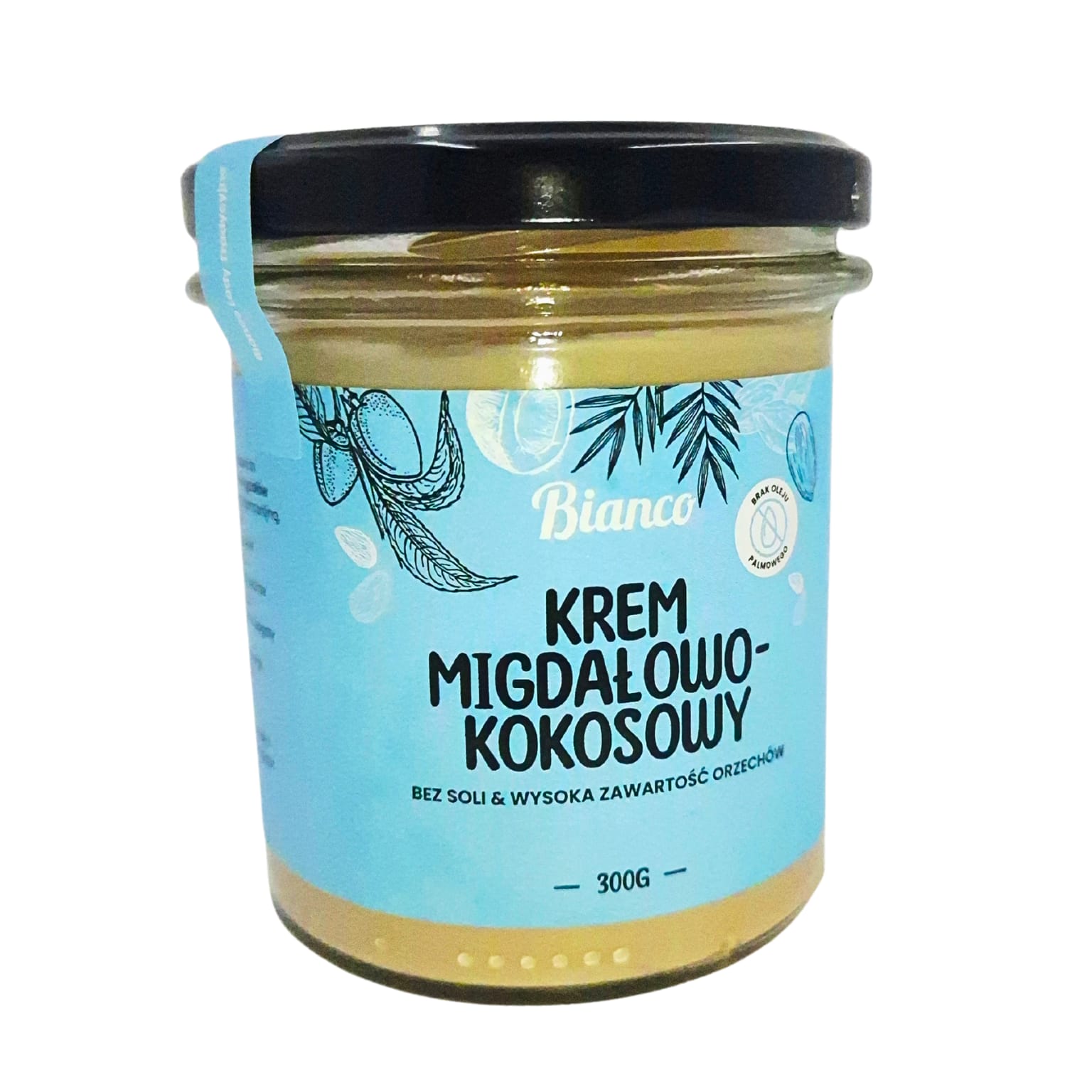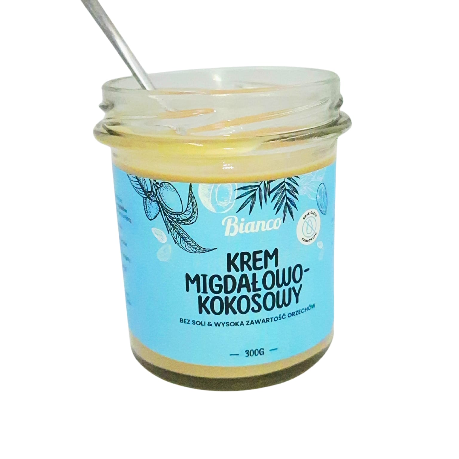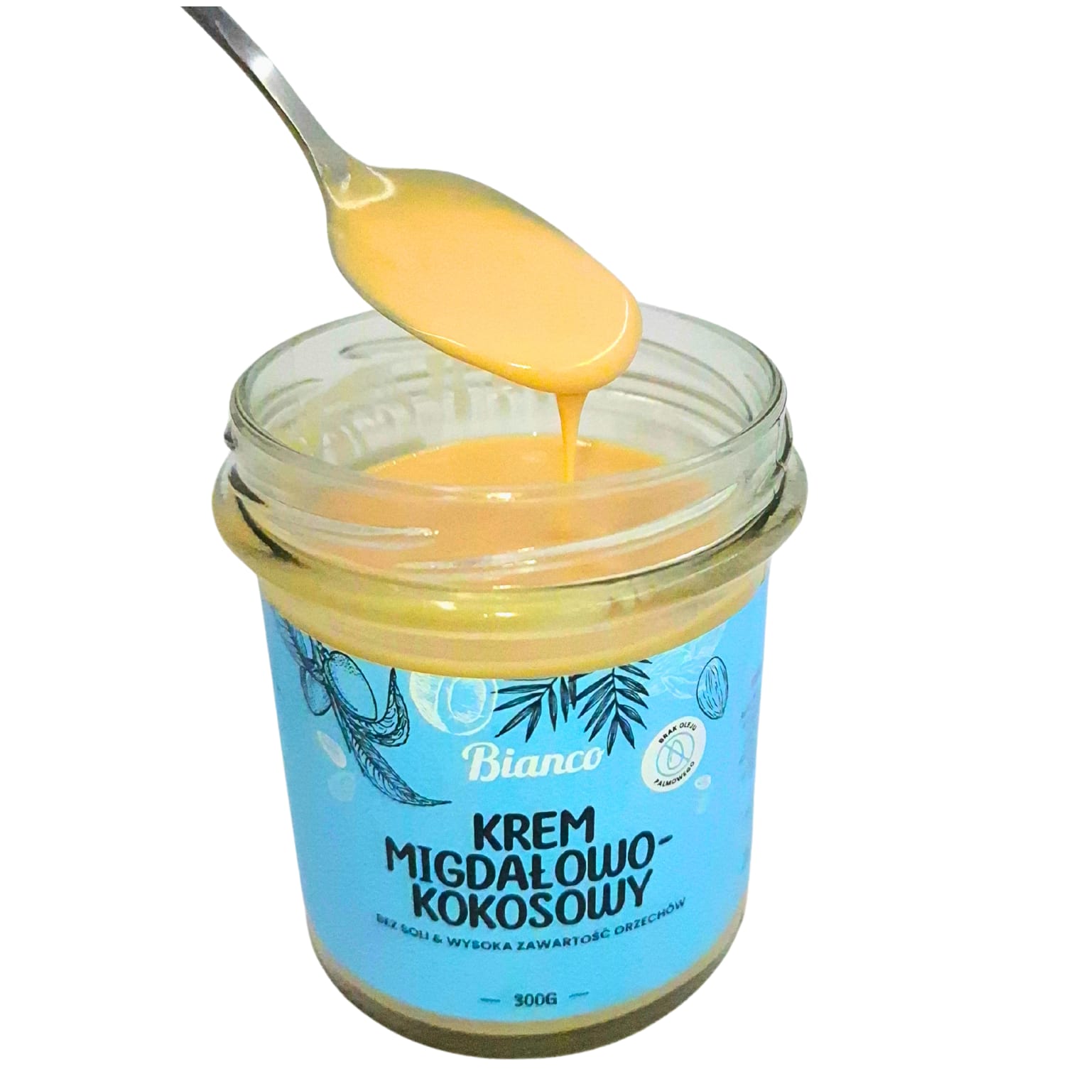 Krem migdałowo-kokosowy o wysokiej zawartości prażonych migdałów i kokosa, powstający w sposób rzemieślniczy. Jego aksamitna struktura i subtelnie słodki, egzotyczny smak tworzą prawdziwie luksusowe doznanie dla podniebienia.