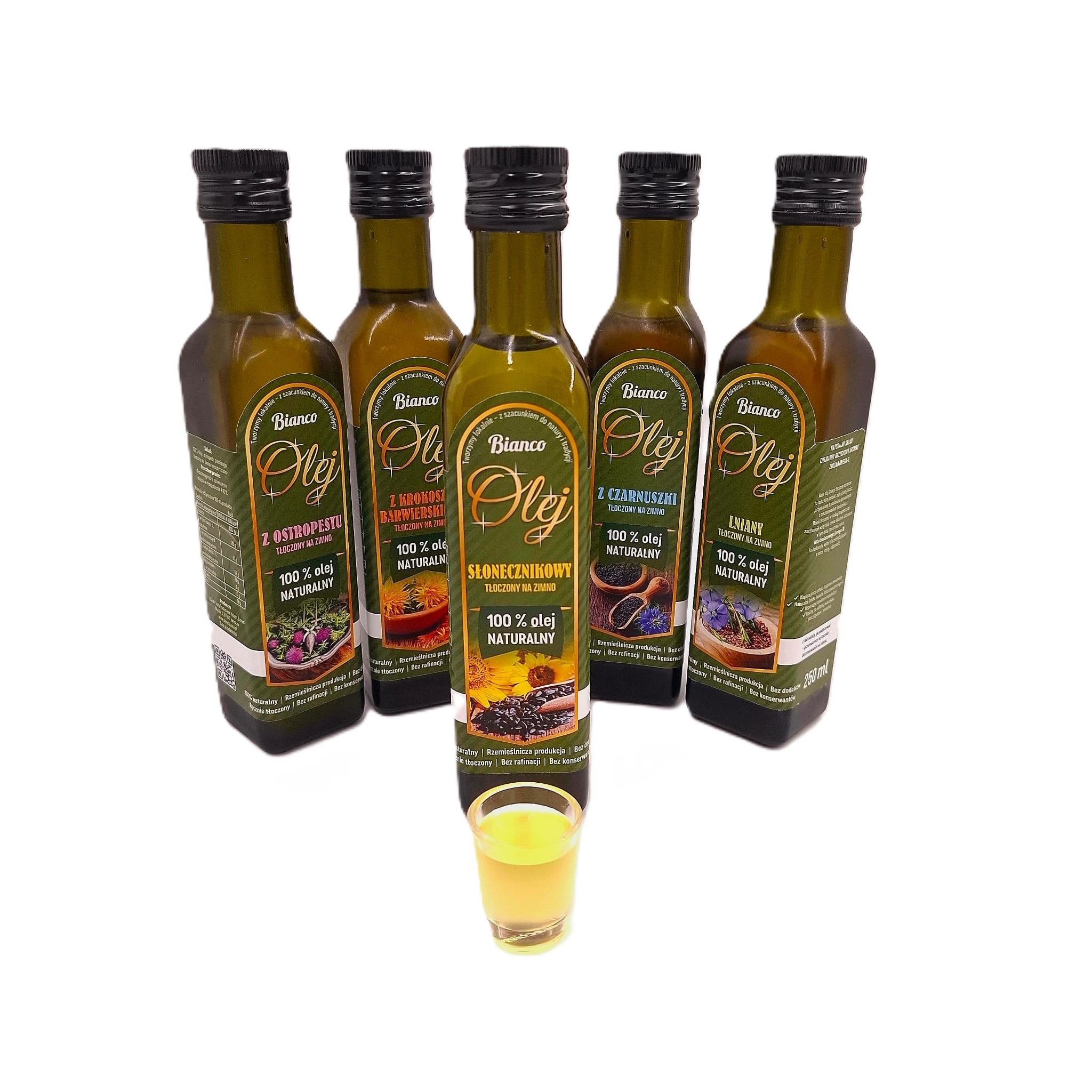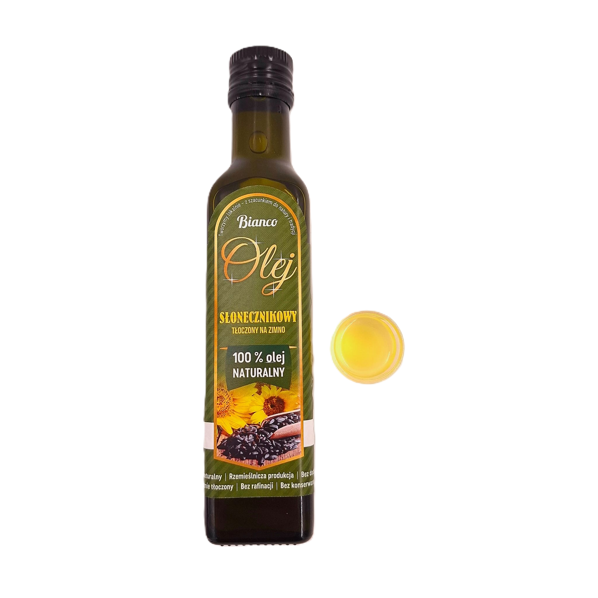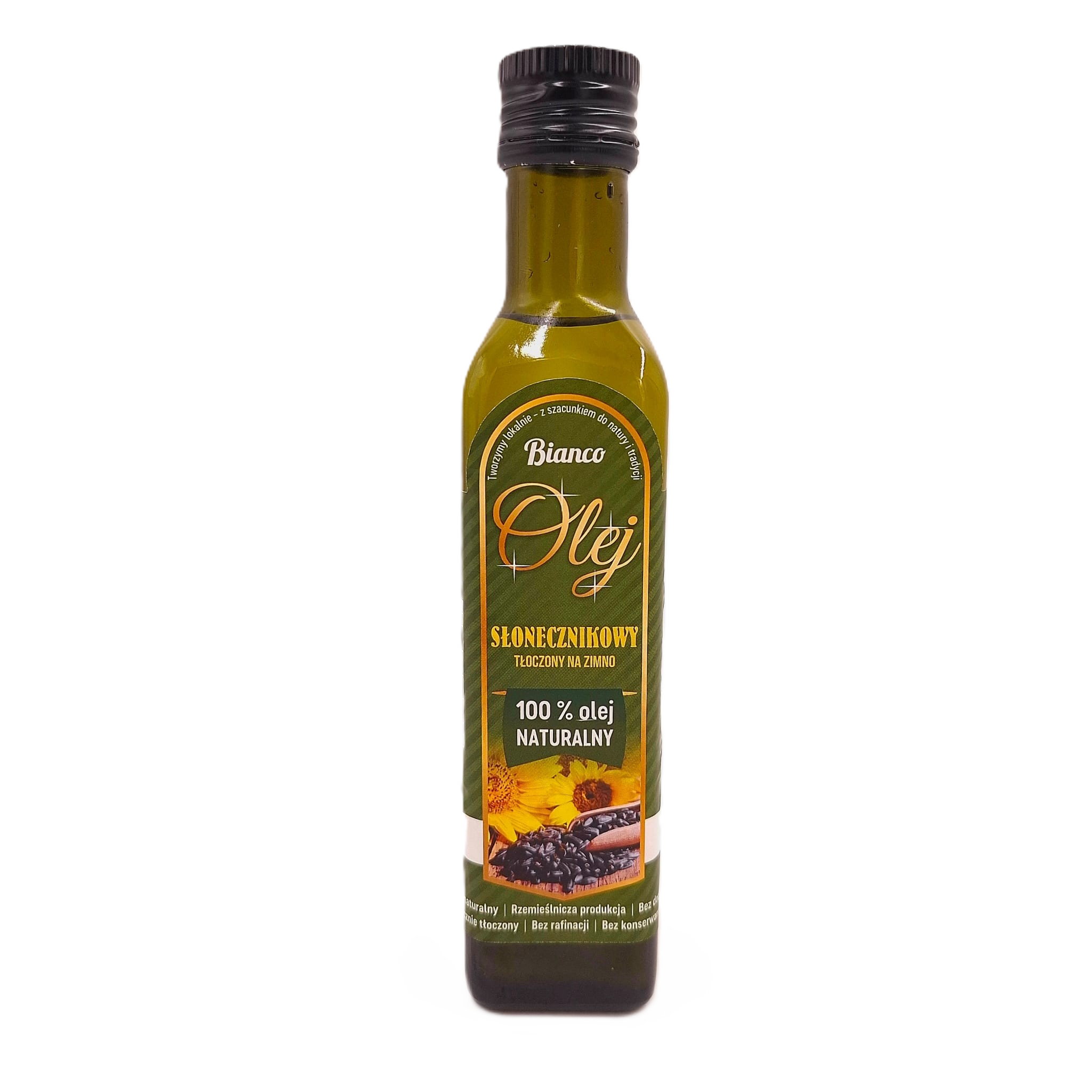 Olej słonecznikowy tłoczony na zimno w Bianco to rzemieślniczy produkt wytwarzany w małych partiach z najlepszych ziaren polskiego słonecznika. Tłoczony powoli, w niskiej temperaturze, zachowuje naturalny smak, złocisty kolor i pełnię wartości odżywczych.