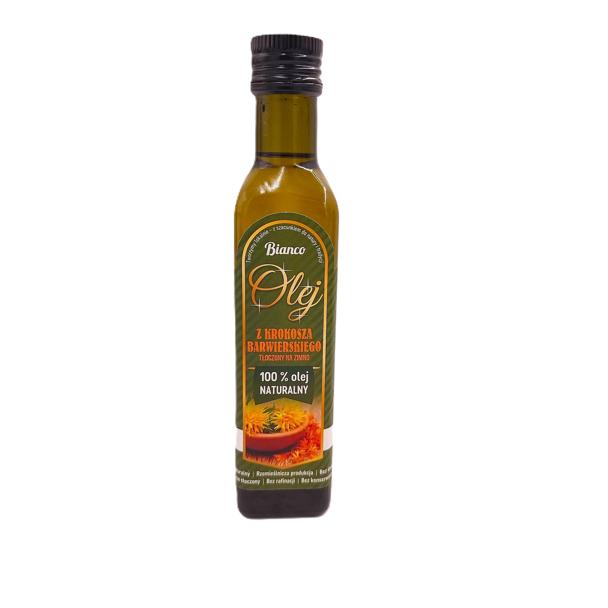 Świeży, rzemieślniczy olej krokoszowy tłoczony na zimno w Bianco. Wysoka zawartość omega-6, 100% naturalny, tłoczony w małych partiach.