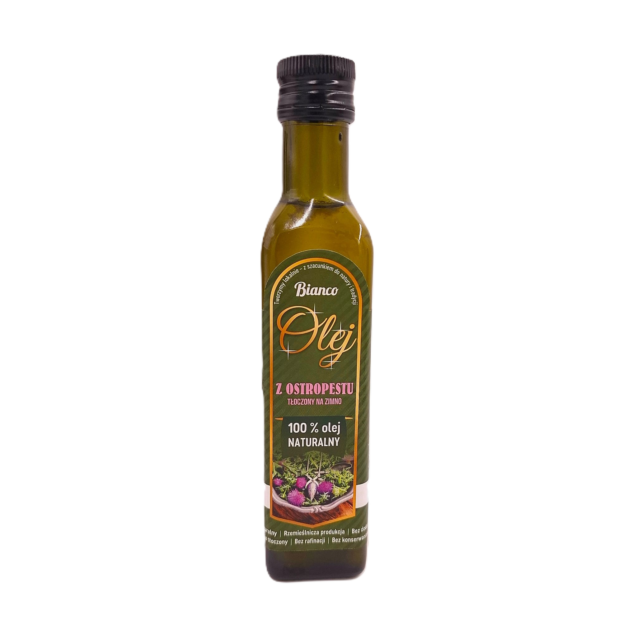Świeży, rzemieślniczy olej z ostropestu tłoczony na zimno w Bianco. Wysoka zawartość sylimaryny i cennych kwasów tłuszczowych, 100% naturalny, tłoczony w małych partiach.